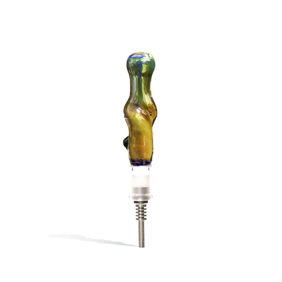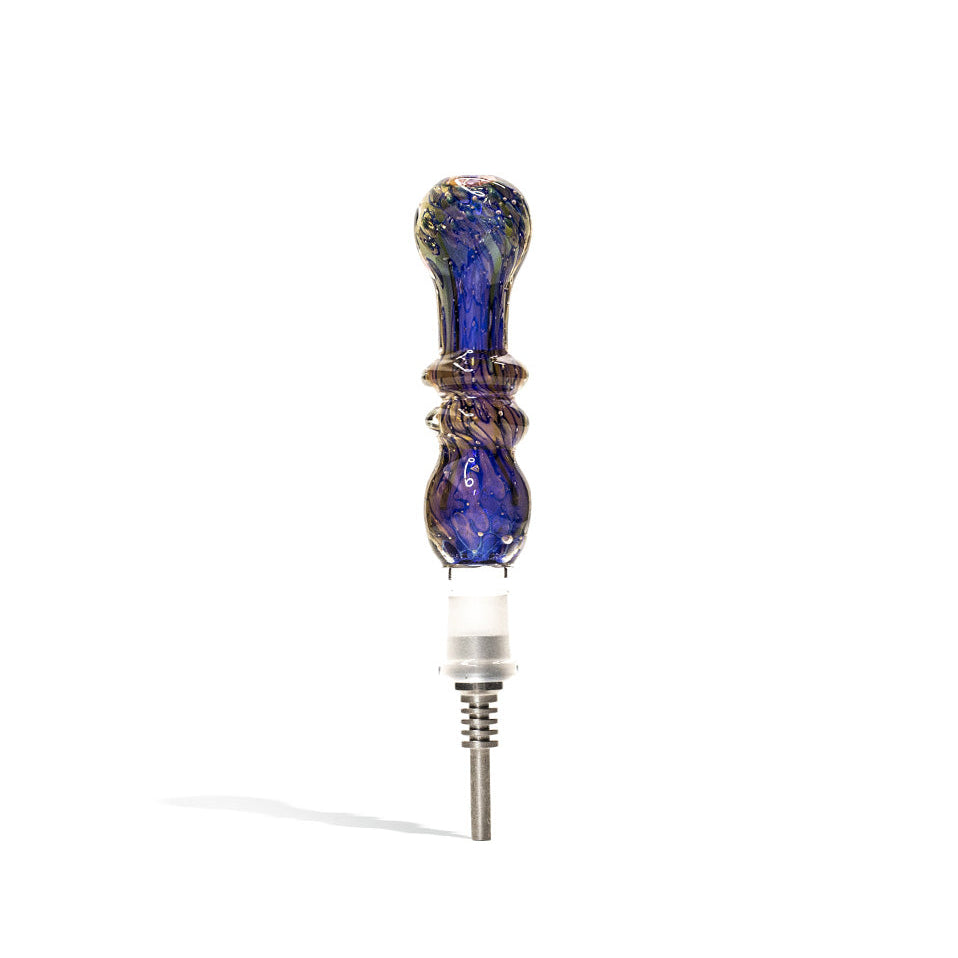 Elevate Your Experience with the Double Thick Glass Nectar Collector, Your Ideal On-the-Go Companion. This portable nectar collector sets itself apart with its unique double-indented design, adding an artistic flair to your sessions. The body features an exquisite fumed blue marble layout for a touch of luxury. The included titanium tip lets you enjoy pure, flavorful draws by dipping directly into your concentrate dish. The package includes a silicone container, clip, and titanium nail for a complete experience.